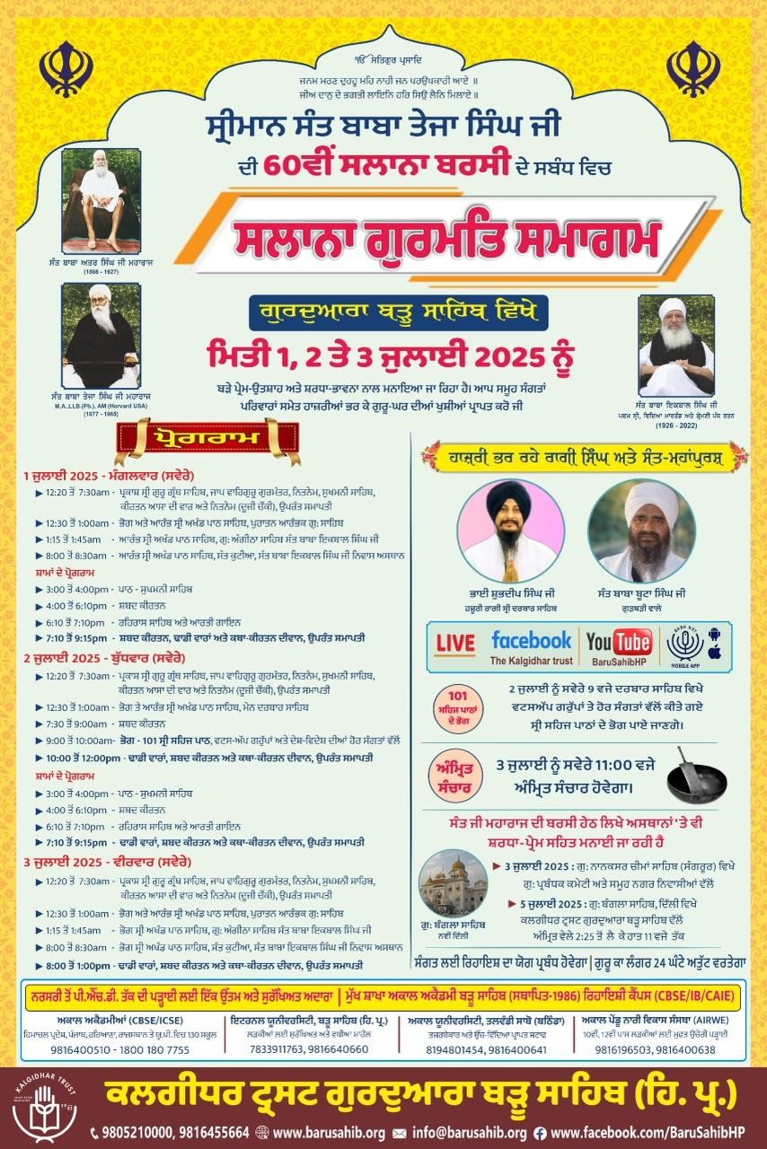 A spiritual event was organized at GurudwaraBaru Sahib, from 1st July to 3rd July 2025, in loving memory of Sant Baba Teja Singh Ji. The gathering aimed to honour the teachings and legacy of the revered saint through devotional music and spiritual reflection.
