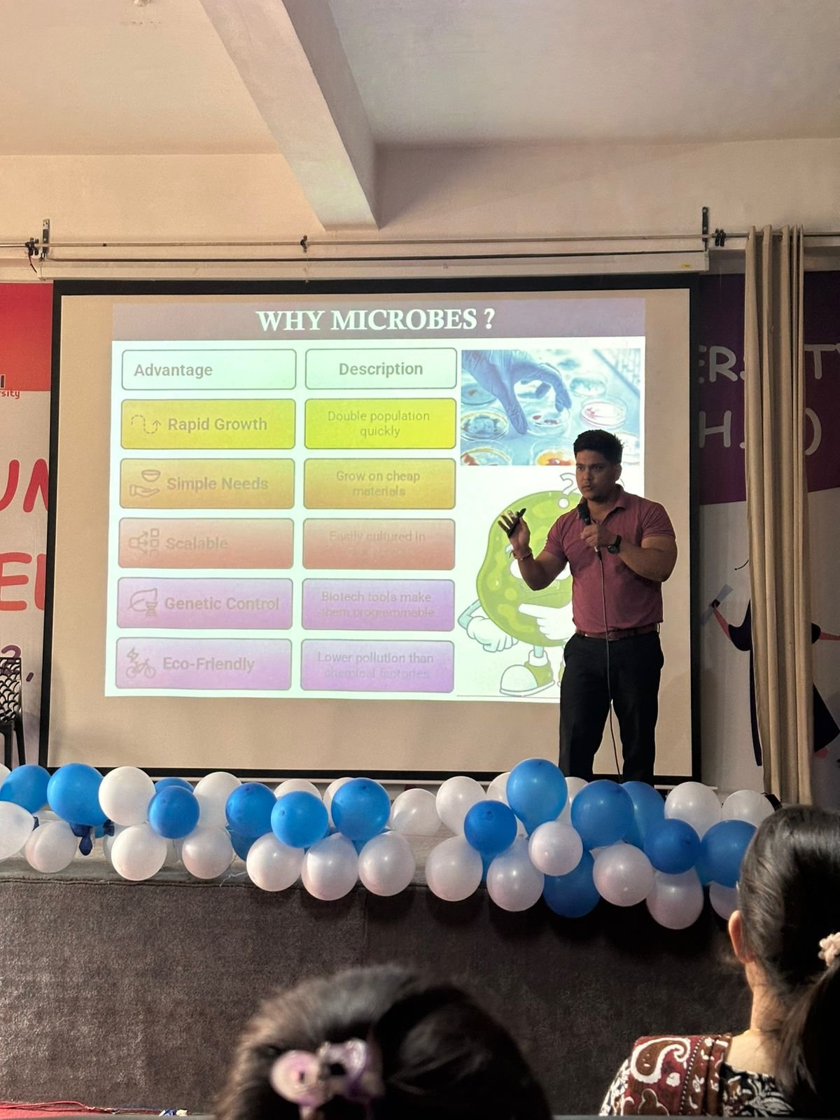 Dr. Hemant Dasila delivered an insightful talk on “Microbes as Industrial Workhorses”, shedding light on how microbes contribute to pharmaceuticals, food, and environmental sustainability.