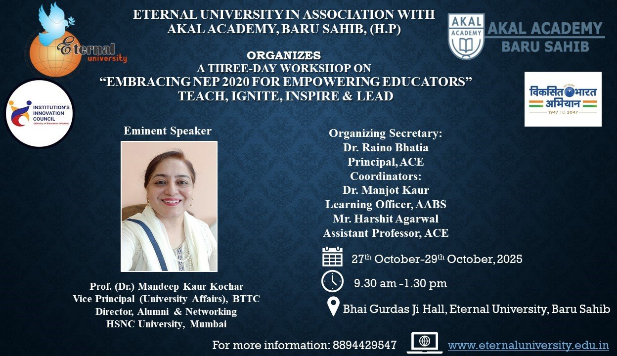 The workshop "Embracing NEP 2020 for Empowering Educators" is a three-day event organized by Eternal University in association with Akal Academy, Baru Sahib (H.P.).